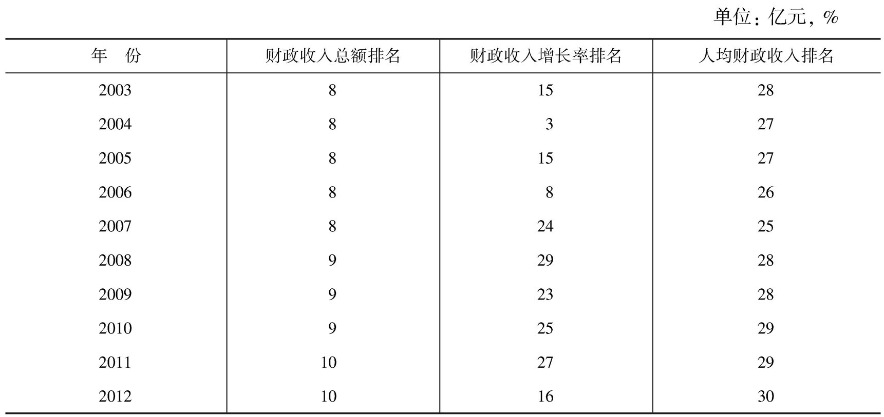 河南省1994~2012年财政收入稳步提高,1994年公共预算收入为93.35亿元,1995年突破100亿元,达到124.63亿元。2005年,河南省公共预算收入总额为537.65亿元,首次突破500亿元;2008年,河南省公共预算收入总额实现了一次巨大的飞跃,达到1008.90亿元,突破了1000亿元大关;在“十一五”期间,河南省的财政收入得到了长足的、快速的增长,于2012年突破了2000亿元,达到2040.33亿元(见表3-1)。从人均规模上看,2005年突破500元,达到573.19元,2008年突破了1000元大关,实现人均财政收入1070元。截至2012年底,河南省人均财政收入实现1935.25元,仍未突破2000元。