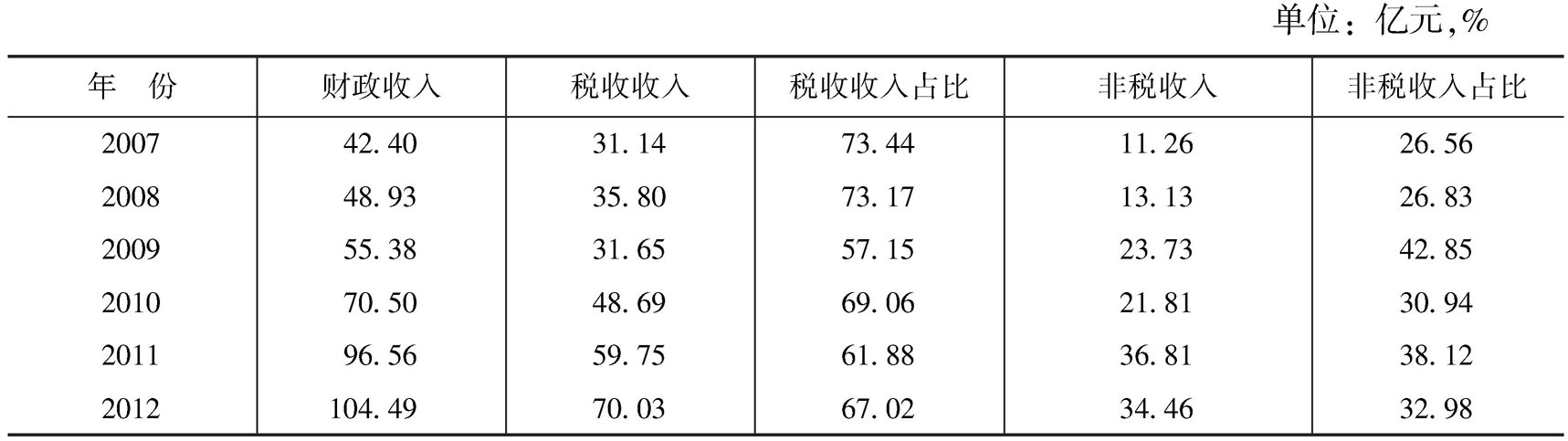 从表29-1来看,2007~2012年,聊城市财政收入逐年增加,2007年达到42.40亿元,2010年突破70亿元,2012年达到104.49亿
