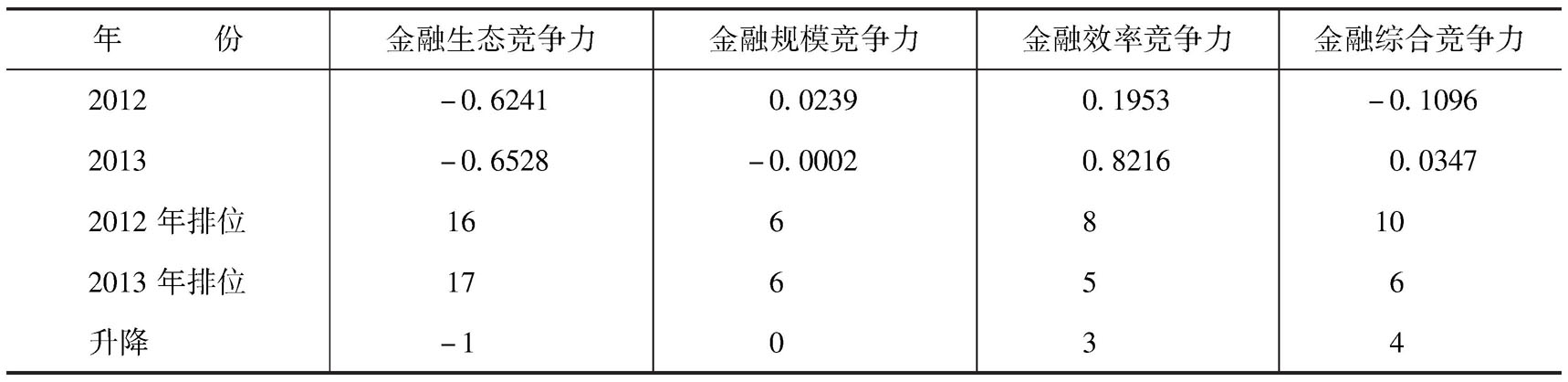 2012~2013年,商丘市区域经济实力竞争力指标及其下属指标在河南省的排位变化情况,如表19-2-1和图19-2-1所示。