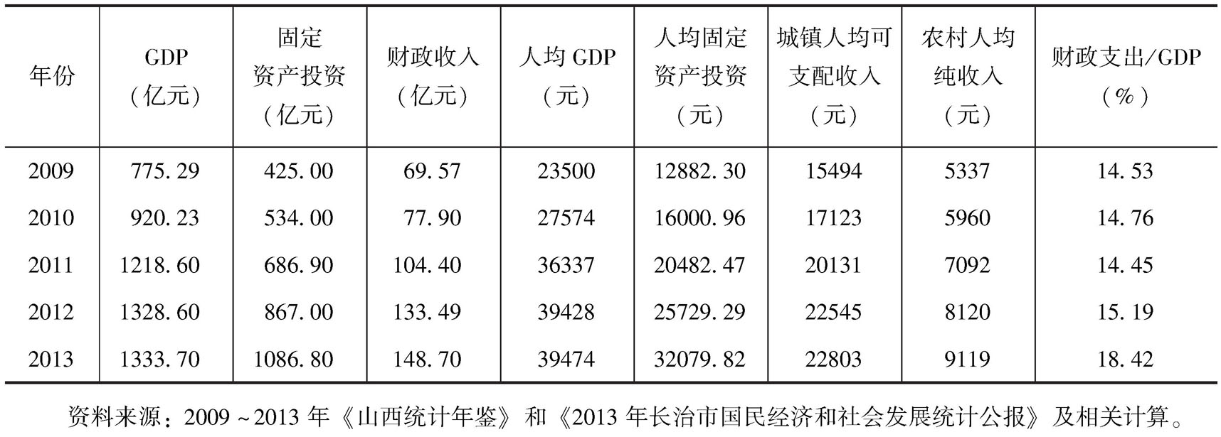 由表27-2-1可知,长治市2013年实现GDP1333.70亿元,比上年增长0.38%;固定资产投资达1086.80亿元,比上年增长25.35%;全年财政收入为148.70亿元,比上年增长11.39%;人均GDP为39474元,比上年下降0.12%。2013年长治市人均固定资产投资为32079.82元,比上年增长24.68%;城镇人均可支配收入为22803元,比上年增长1.14%;农村人均纯收入为9119元,比上年增长12.30%;财政支出/GDP为18.42%,上升了3.23个百分点,说明政府投