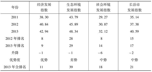 (1)2013年长治市发展指数排位处于第17位,表明其在中原经济区处于中势地位,与2012年相比排位下降2位。