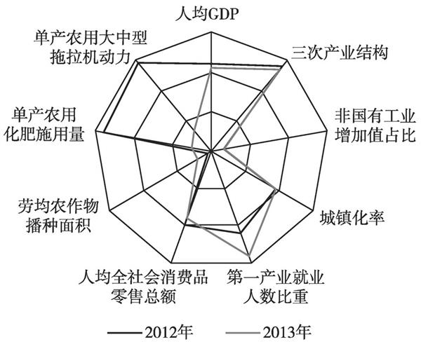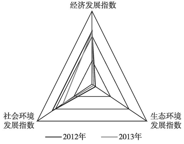 (3)从雷达图图形变化看,2013年与2012年相比,面积略有缩小,长治市发展指数排位呈下降态势。
