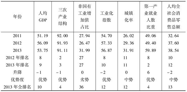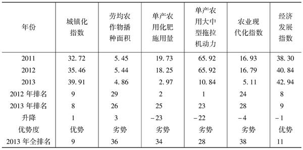 (1)2013年长治市经济发展指数排位处于第9位,表明其在中原经济区处于优势地位,与2012年相比排位下降1位。其中工业化指数排位处于第10位,与2012年相比排位下降2位;城镇化指数排位处于第8位,与2012年相比排位上升1位;农业现代化指数排位处于第28位,与2012年相比排位下降4位。