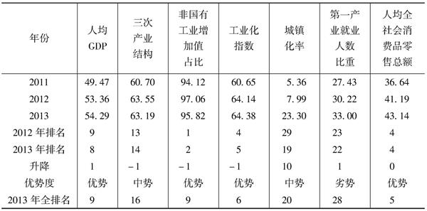 (2)从方案层指标的优势度看,人均GDP、非国有工业增加值占比、工业化指数、人均全社会消费品零