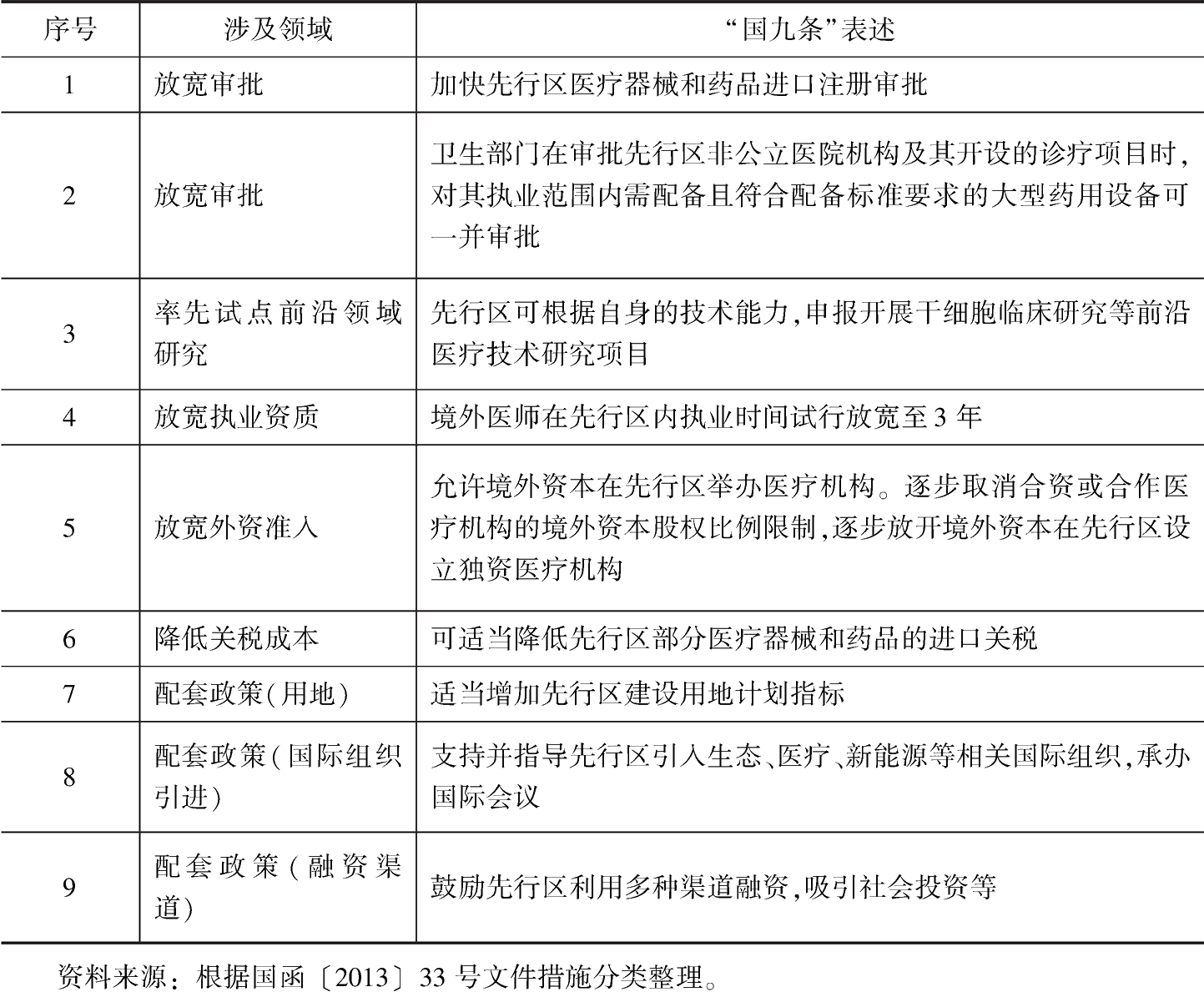 博鳌乐城国际医疗旅游先行区(以下简称“先行区”),是我国第一家以国际医疗旅游服务、低碳生态社区和国际组织聚集为主要内容的国家级开发园区,于2013年2月28日经国务院批准设立,规划范围20.14平方公里。为支持先行区的发展,《国务院关于同意设立海南博鳌乐城国际医疗旅游先行区的批复》(国函〔2013〕33号)中明确,赋予先行区九条特殊优惠政策措施(以下简称“国九条”),“国九条”涉及放宽审批(2条)、率先试点前沿领域研究(1条)、放宽执业资质(1条)、放宽外资准入(1条)、降低关税成本(1条)及配套政策(3条)等多个领域,这些措施本身具有较大的突破性,从而具有较高的政策含金量。具体详见表1。