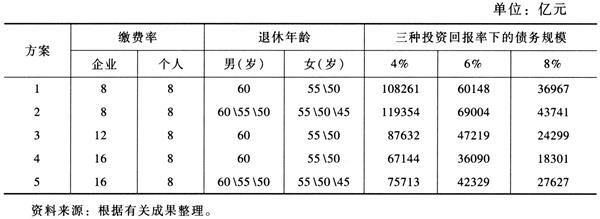 方案1表明,如果政府承担“老人”、“中人”所有债务,企业缴费率可以降到8%,加上个人缴费率8%,总缴费率为16%,相当于保证60%左右的养老金替代率。课题组认为,这与人口老龄化更严重的日本(缴费率为17.5%,替代率为60%左右)类似,是比较合理的。因此,可以把方案1称为标准方案。上海财经大学公共政策研究中心:《2002中国财政发展报告——社会保障公共政策研究》,上海财经大学出版社,2002。方案4和5的缴费率接近于现行的缴费率(企业18%,个人7%),政府的债务降低了,但企业的债务却增加了。方案4和方案5的差别说明提前退休将增加养老金的债务。根据方案4,在目前的缴费率以及投资回报率为4%的情况下,养老金的债务总额为67144亿元。