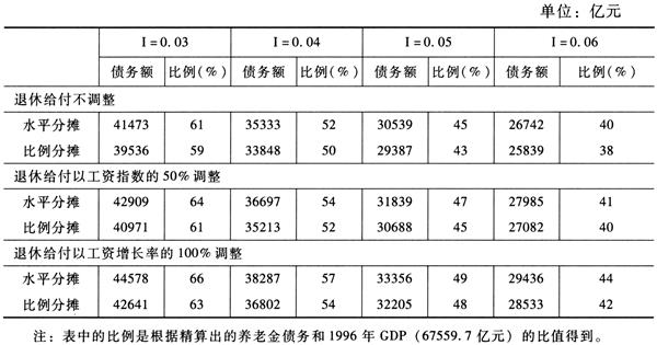 王晓军假定男女两性合并,退休年龄为58岁,以1980~1990年全国市镇从业人口生命表提供的分年龄死亡率作为精算估计的死亡率,利息率分别采取了3%、4%、5%、6%的假设条件下(退休金假设每年给付一次、老人退休金给付规定为工作35年得到退休前工资的80%、社会平均工资年增长率为3%),得到养老金债务在25839亿元至44578亿元之间(见表11-2)。1996年末,全国基本养老保险基金滚存积累余额为579亿元。在利率4%、养老金以社会平均工资增长率50%指数化调整、水平法下的净债务额为36118亿元(36697-579),约占当年GDP的53%。王晓军:《中国养老金制度及其精算评价》,经济科学出版社,2000。