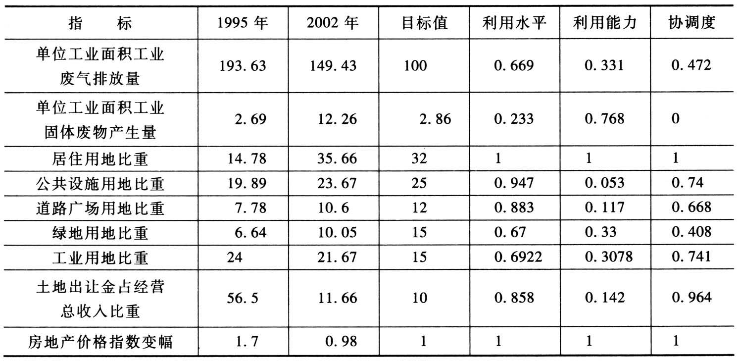 从表1可知:长沙市城市居住用地占建设用地的35.68%,超过国家标准。从变化趋势来看,由于长沙市房地产市场发展较快导致居住用地较大,应加以合理控制。工业用地面积占城市用地面积的5.04%,占建成区面积的21.67%,未达到全国城市平均用地标准,以后可以扩大工业用地面积,加快长沙市工业建设,主要以机械工业为主,来带动其他行业的发展。其他几方面的用地均在全国平均水平之内。调研结果还发现长沙市城市面积在1995~2002年累计增加189平方公里,年平均增长速度6.11%;建城区面积累计增加18.38平方公里,年平均增长速度3.6%;居住面积累计增加32.84平方公里,年平均增长速度19.45%;道路广场用地累计增加3.83平方公里,年平均增长速度10.09%;各类用地均呈上升趋势。这是经济高速增长和城市化进程显著加快的标志,说明城市建设取得了一定成就。