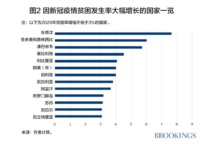 5.另一个衡量新冠疫情影响的角度是了解哪些国家贫困率增幅最大,如图2所示。一些国家极端贫困率增幅超过3%,其中小型岛国如东帝汶、圣多美和普林西比、所罗门群岛等,原本就属于60个无法完成可持续发展之消除贫困目标的国家,其极端贫困率在3%以上。新冠疫情导致这些国家贫困状况进一步恶化。