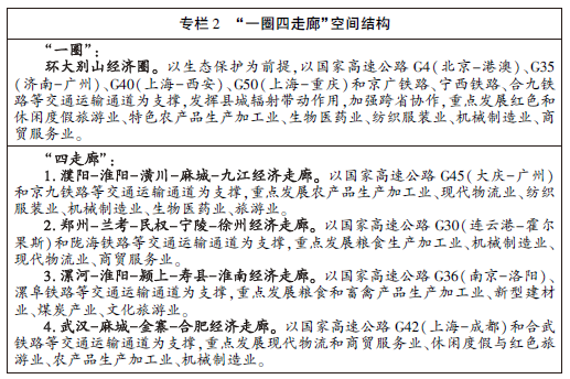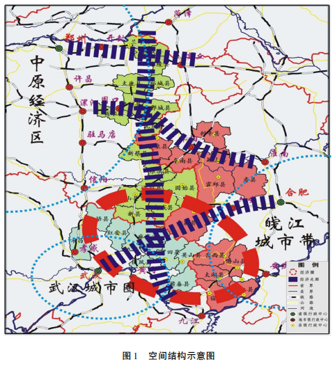 依托铁路、高速公路等综合运输通道,加强产业集聚区建设,积极融入武汉城市圈、中原经济区和皖江城市带,密切与合肥、郑州、武汉及亳州、阜阳、六安、安庆、开封、商丘、信阳、周口、驻马店、黄冈、孝感等周边城市的联系,积极承接长江三角洲、珠江三角洲等地区产业转移,推进新型工业化、城镇化与农业现代化协调发展,构建“ 一圈四走廊” 的空间结构,形成空间布局合理、经济联系紧密、产业特色鲜明、城镇体系完善的发展格局。