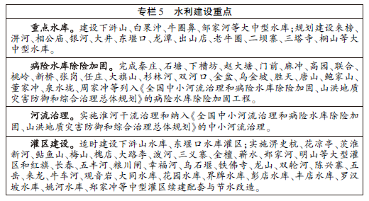 加强水利工程建设。以妥善安置移民和保护生态为前提,适时兴建出山店等水库,提高洪水拦蓄和灌溉能力。加快推进病险水库和堤防除险加固。完成农村饮水安全工程,加强小水窖、小水池、小塘坝、小泵站、小水渠“ 五小水利” 工程和抗旱水源井建设,实施“ 机井通电” 和“ 以电代油” 等配套工程。加快灌区续建配套与节水改造,提高农田灌溉保证率和灌溉水利用效率。加大淮河及其他中小河流治理。提高城镇排水防洪能力。加快沿淮行蓄洪区调整和建设。