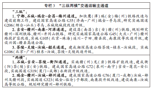 交通运输主通道。加快推进国家高速公路、国家铁路等重点项目建设,加强国道和重要铁路改造升级。规划建设“三纵两横”交通运输主通道,强化主通道互联互通。推进赣州黄金机场、井冈山机场等改扩建。构建赣州区域性综合交通运输枢纽,完善井冈山、瑞金、宜章、茶陵等运输枢纽功能,提高运输与中转能力。加强与鄱阳湖生态经济区、环长株潭城市群、海峡西岸经济区、珠江三角洲地区等的交通联系,形成沟通东南沿海与中西部地区的交通运输主通道。
