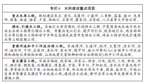 加强水利工程建设。坚持全面节水和适度调水相结合,完善甘肃引洮供水二期等水利工程前期工作,全面完成病险水库除险加固,积极推动中小型水源工程建设,提高工业能源基地及城镇用水保障能力,加快大中型灌区节水改造和大型灌排泵站更新改造,完善灌区末级渠系配套,实施渭河、洮河、湟水和泾河等重要支流和中小河流综合治理。加强城镇防洪体系建设和山洪地质灾害防治。
