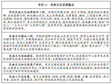 加强民族文化设施建设和民族文化及自然遗产保护。规划建设武陵山综合图书馆、武陵山大剧院、武陵山博物馆等文化基础设施。