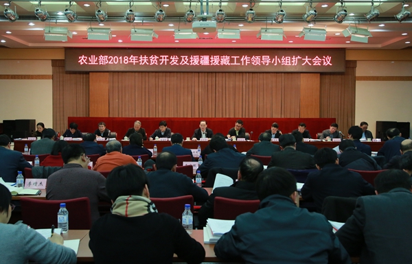 1月30日,农业部副部长余欣荣主持召开2018年农业部扶贫开发及援疆援藏工作领导小组扩大会议,总结2017年农业扶贫开发及援疆援藏工作情况,研究部署2018年工作任务。会议强调,要深入学习贯彻习近平总书记扶贫开发重要战略思想和党的十九大、中央农村工作会议精神,进一步提高政治站位,牢固树立“四个意识”,聚焦工作重点,深入推进产业扶贫,为打好脱贫攻坚战提供支撑。